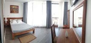 Toutes les chambres sont équipées de balcon privé, sanitaires privés avec eau chaude, télévision à écran plat avec chaines internationales, placard, coffre, sèche cheveux, chauffage en hiver et connexion wifi gratuite. Pour les Suites, viennent s’ajouter un coin salon, un minibar, une kitchenette équipée.